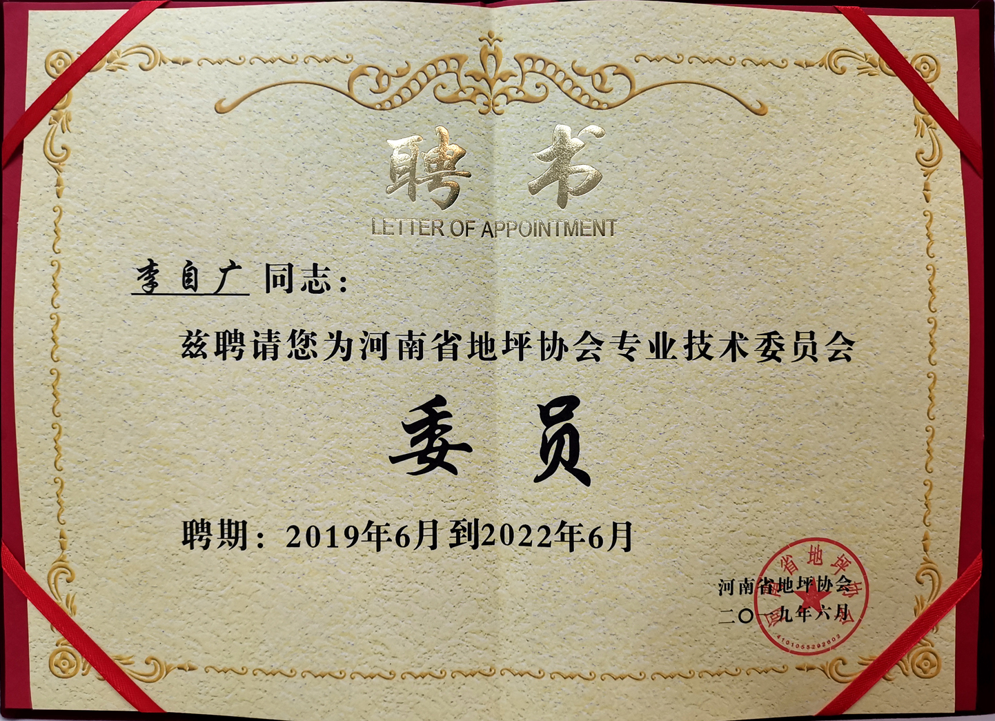 榮獲:河南省地坪協(xié)會**技術委員會:“委員”稱號